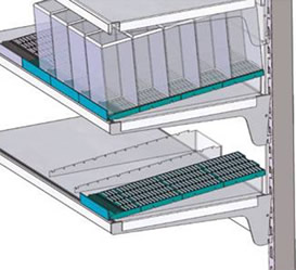 System Rolkowy może być umieszczony na istniejącej poziomej półce dzięki specjalnym wkładkom klinowym.